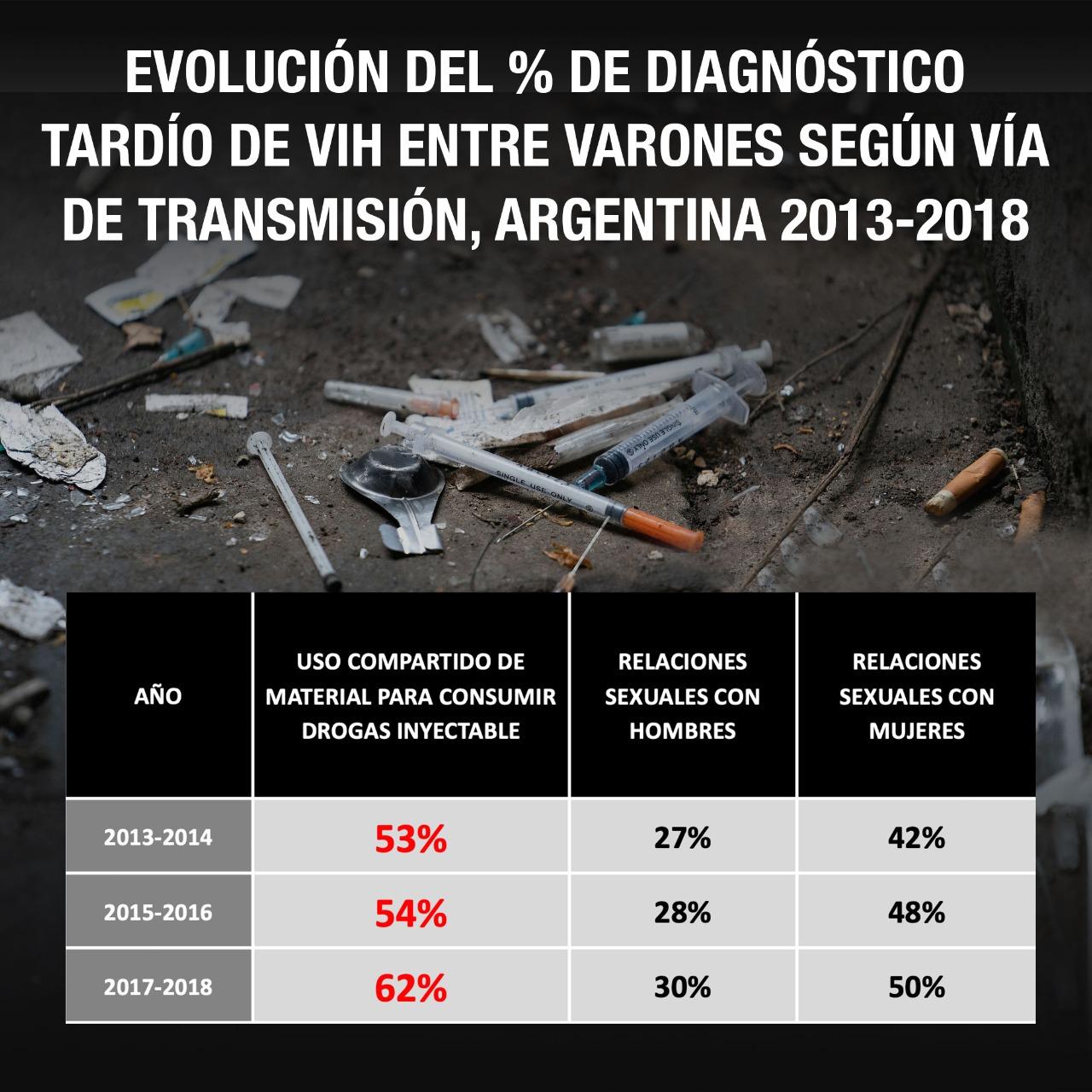 De acuerdo con el ultimo boletín epidemiológico sobre el VIH, Sida e Infecciones de Transmisión Sexual en la Argentina, publicado en diciembre de 2019 por el Ministerio de Salud de la Nación, los porcentajes de diagnóstico tardío de HIV muestra su mayor magnitud en los casos en que se ha constatado el contagio por el uso compartido de agujas, jeringas y/o otros elementos del equipo de inyección.