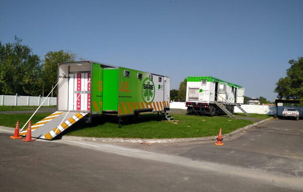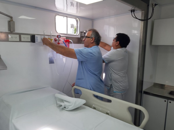 En la primera flamante unidad, que està instalada en la puerta del hospital Eurnekian de Ezeiza, trabajarán siete médicos y seis efermeros para uso exclusivo en el caso de que aumente las consultas ante la actual contingencia sanitaria. Además, ese camión sanitario está acompañado por una unidad del SAME con servicio de Terapia Intensiva Móvil, con 4 camas totalmente equipadas y un policonsultorio.