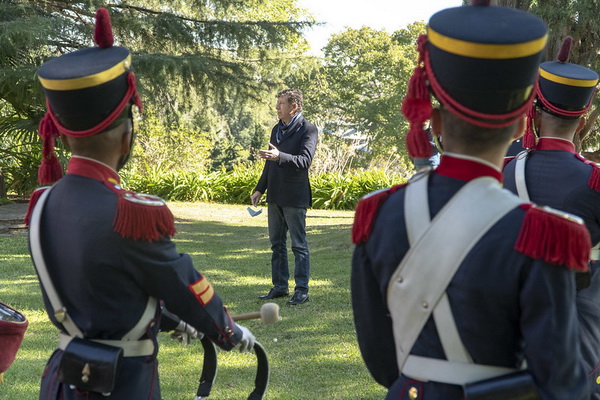 Esta mañana en los jardines de la casona sonaron las estrofas del himno de la mano de la banda de la Fanfarria Militar Alto Perú del Regimiento de Granaderos a Caballo «General San Martín». También interpretaron las marchas de San Lorenzo y de las Malvinas.
