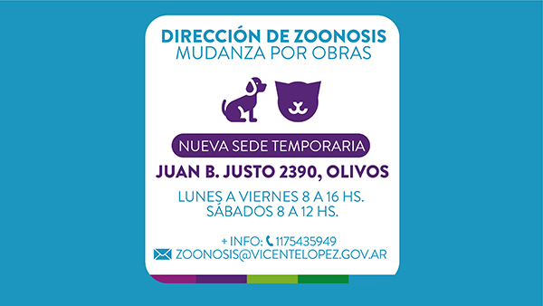 Se informa a los vecinos que de manera temporaria la Dirección de Zoonosis estará presentando sus servicios en la calle Juan B. Justo 2390, Olivos, por los próximos 2 meses debido a obras.