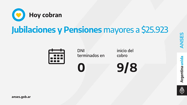 El organismo, a cargo de la Lic. Fernanda Raverta, informa que hoy se abonan jubilaciones, pensiones, Asignación Universal por Hijo, Asignaciones Familiares y los programas Hogar y Alimentario PAMI. Cabe destacar que este mes se deposita, junto con los haberes mensuales, el bono de 5000 pesos para titulares previsionales. Así, las personas que considerando la suma de todas sus prestaciones cobran hasta dos haberes mínimos (46.129,40 pesos) reciben el monto total y las que perciben entre 46.129,41 y 51.129,40 pesos, el equivalente hasta alcanzar esta última cifra.