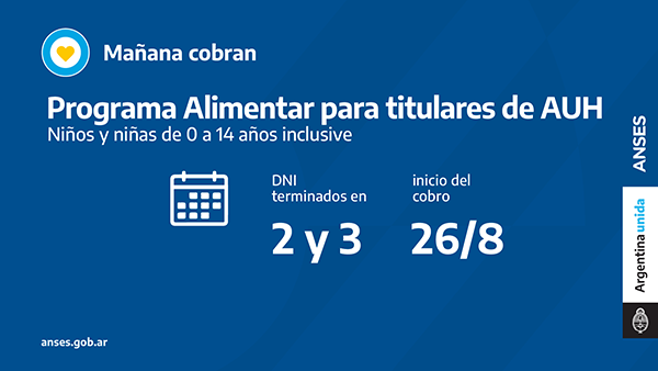 En el marco del Plan Argentina contra el Hambre del Ministerio de Desarrollo Social, la ANSES acompaña con el pago del programa Alimentar. Mañana cobran titulares de la AUH con hijos e hijas de 0 a 14 años inclusive con documentos finalizados en 2 y 3, que no poseen la tarjeta plástica y reciben el dinero en la misma cuenta de la prestación.