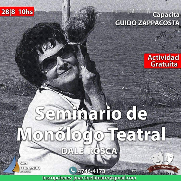 “Dale roca” es un curso de monólogo teatral, se trata de un espacio para darle vida a todas las voces que desbordan y que piden salir a escena. La propuesta está dirigida a actores, actrices, escritores, directores, dramaturgos y afines a las artes escénicas. Los interesados se pueden inscribir de forma gratuita escribiendo al correo: jmartinelliteatro@gmail.com