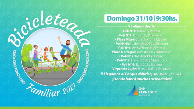 En el marco de los festejos por la primavera, el Municipio de San Fernando invita a todos los vecinos a sumarse a la gran “Bicicleteada Familiar 2021” que se realizará este domingo 31 de octubre, a las 9:30hs, con partida desde diez puntos ubicados estratégicamente en el distrito. La llegada será en el Parque Náutico, en Almirante Martín y Escalada. La entrada es libre y gratuita.