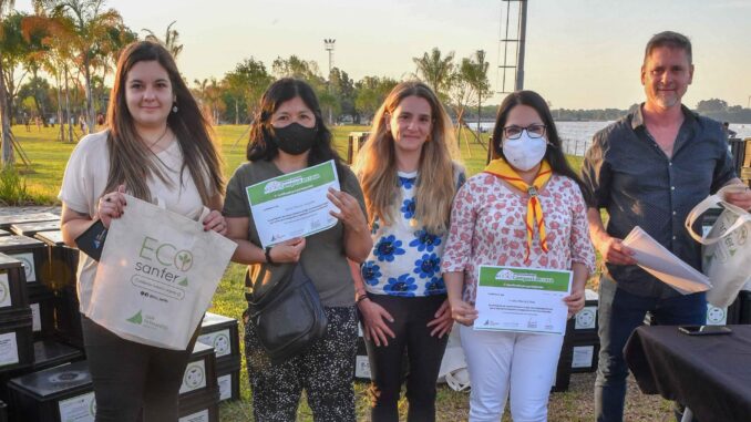 En el recientemente ampliado Parque Náutico y junto al río se llevó a cabo la entrega de diplomas del taller online de compostaje a través del programa integral ‘Eco Sanfer’, con el fin de incentivar el cuidado del medio ambiente mediante el reciclaje de residuos orgánicos. Unos 500 participantes recibieron ‘composteras’ y bolsas ecológicas por haber finalizado. “Ya llevamos 1500 vecinos capacitados que se suman a las acciones ecológicas del Municipio para pensar en la biodiversidad y estamos felices por la gran participación”, dijo la Secretaria de Desarrollo Social, Educación y Medio Ambiente y candidata a Concejal, Eva Andreotti.