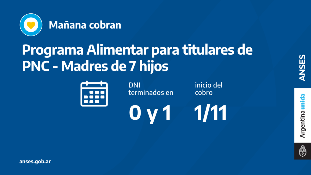 En el marco del Plan Argentina contra el Hambre del Ministerio de Desarrollo Social, ANSES acompaña con el pago del programa Alimentar. Mañana cobran Madres de 7 hijos que perciben PNC con documentos finalizados en 0 y 1, no poseen la tarjeta plástica y reciben el dinero en la misma cuenta de la prestación.