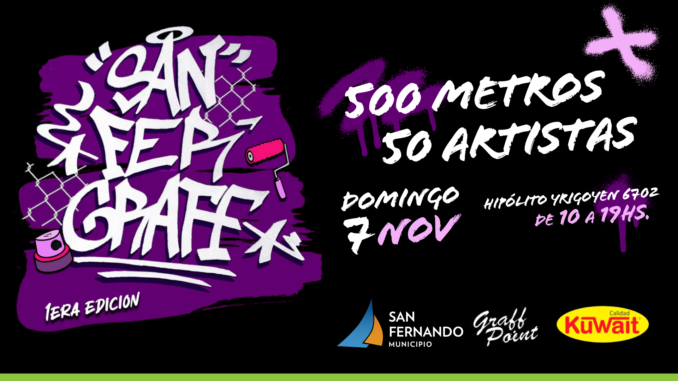 El Municipio de San Fernando a través de su Dirección General de Cultura y Turismo – Área de Artes Visuales, invita al evento San Fer Graff, primera edición. Se llevará a cabo en una jornada de 10 horas, donde más de 50 artistas estarán trabajando en vivo sobre una pared de 500 metros de largo.