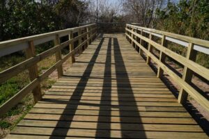La Pasarela Las Heras tiene un recorrido con tres miradores y está íntegramente construida en madera de pino con postes de palmera. Además, se colocaron cestos de recolección de residuos, se agregaron nuevas especies nativas y se realizó una parquización integral del espacio.