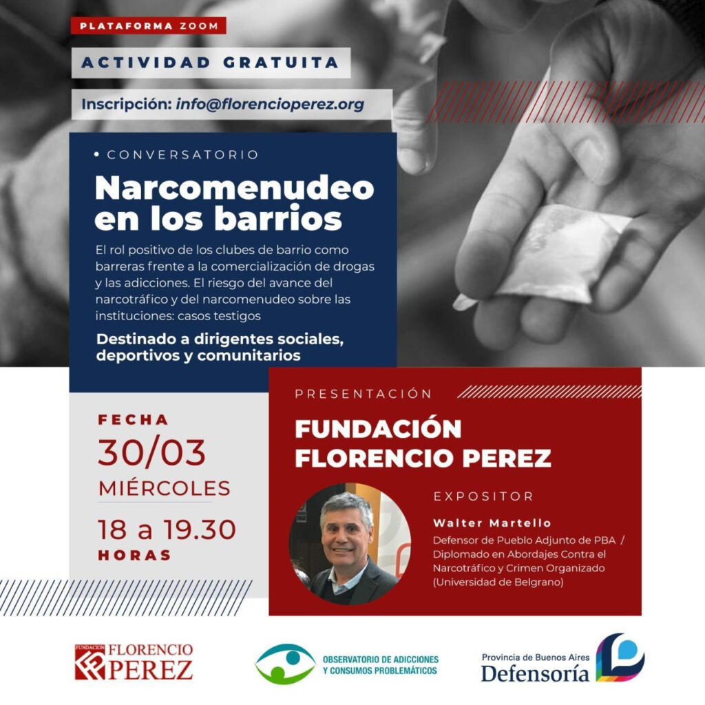Se trata de un conversatorio organizado por la Fundación Florencio Pérez. Walter Martello -Defensor del Pueblo Adjunto bonaerense y Diplomado en Abordajes Contra Narcotráfico por la Universidad de Belgrano- disertará sobre “Narcomenudeo en los barrios”.