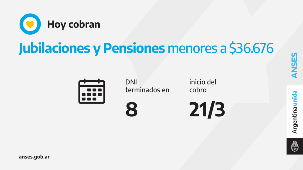 Las sucursales bancarias habilitadas atenderán por ventanilla a jubilados, jubiladas, pensionados y pensionadas con documentos terminados en 8 cuyos haberes NO SUPEREN la suma de 36.676 pesos.