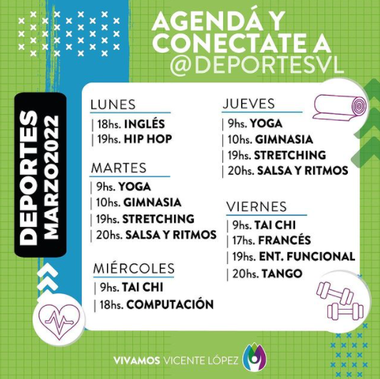 Las actividades son gratuitas, sin inscripción previa, y se dictan en vivo a través del instagram @deportesvl. En el caso de que algún interesado esté ocupado en los horarios del cronograma, se recuerda que todas las clases se graban y quedan guardadas en el perfil de Instagram.