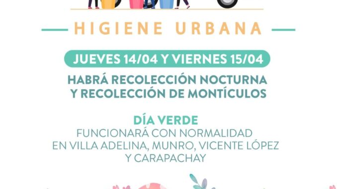 La Municipalidad de Vicente López informa a los vecinos que el jueves 14 y el viernes 15 de abril habrá recolección nocturna de residuos y recolección de montículos, por parte del equipo de Higiene Urbana.