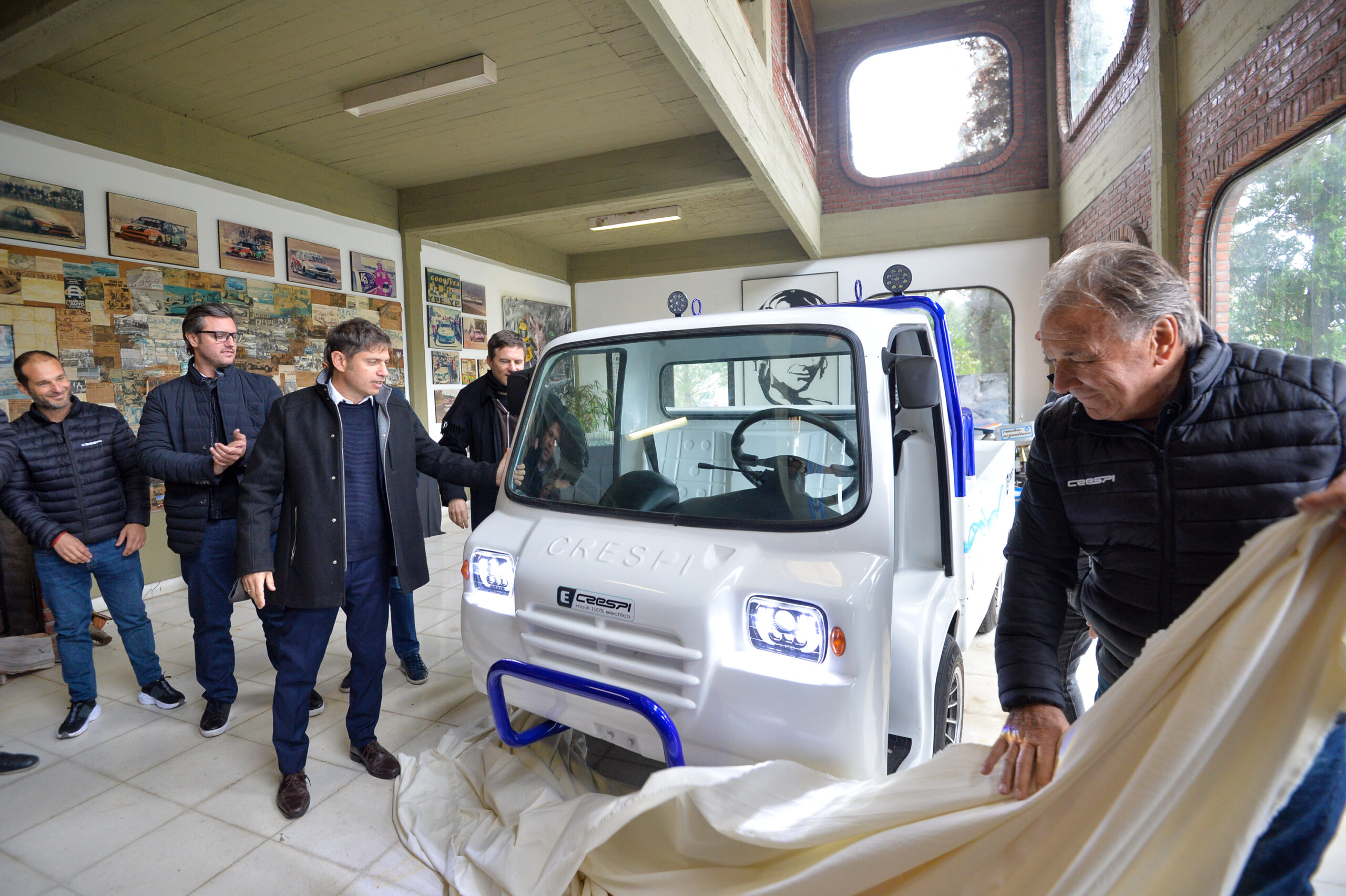 A continuación, el gobernador Kicillof se trasladó hacia la fábrica de autos Crespi Competición, donde se presentó el “Campo Móvil”, primer vehículo utilitario 100% eléctrico fabricado en el país, que podrá desplazarse por zonas rurales y complejos fabriles, adaptándose para realizar tareas de cortadora, grúa, pulverizadora y volquete.