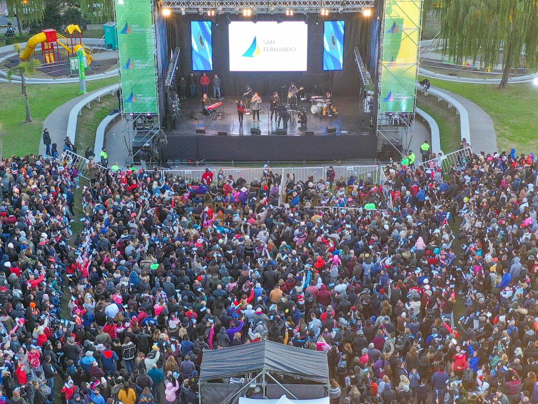 En una jornada a pleno sol, el Municipio de San Fernando organizó el festejo del Día de la Patria en el Parque del Bicentenario, donde una multitud de vecinas y vecinos disfrutó de comidas típicas y la presentación de los grupos Las Dos Lunas, La Cuatrera, La Clave, el Elenco Municipal de Danzas, Danzarte, La Bolada Folk, La Popular, El Ceibal, Alma Santiagueña, la Compañía Gaucha Argentina y el Campeón Nacional de Malambo Fabián Serna, como también las de Leo Saúl, Fede Churruarín e Isaías Montero. El cierre de Nahuel Pennisifue el broche de oro.