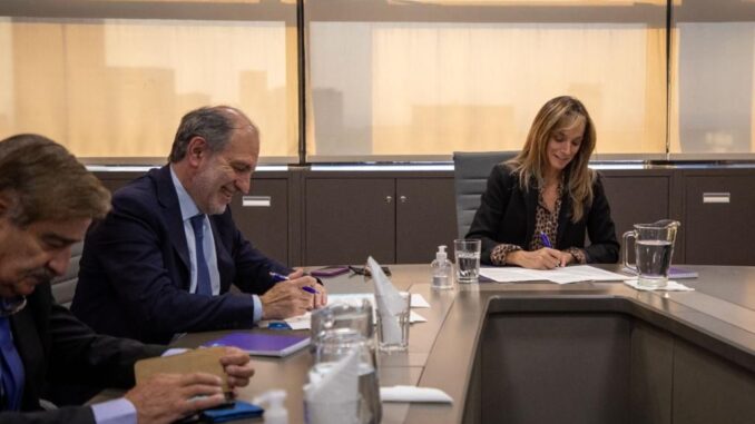 La Presidenta de AySA, Malena Galmarini recibió a su par del Banco Nación Argentina (BNA), Eduardo Hecker para celebrar la firma del convenio que permite concretar la primera etapa del programa ConectarT. Por medio de este convenio, el BNA otorgará créditos con tasas accesibles para que las vecinas y vecinos que aun no se han podido conectar a las redes de agua y cloaca que pasan frente a sus domicilios puedan financiar las obras y materiales necesarios para poder acceder a los servicios.