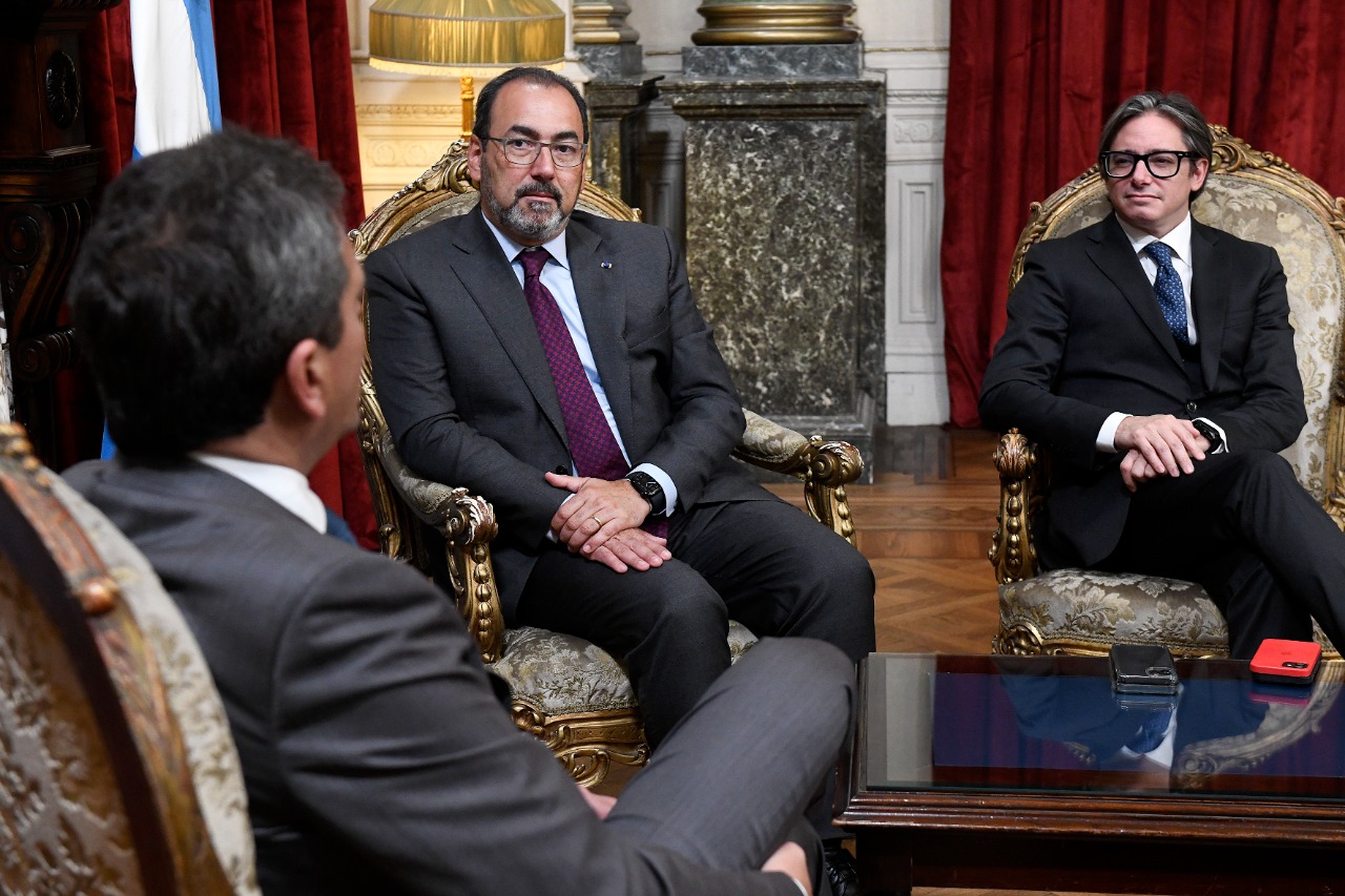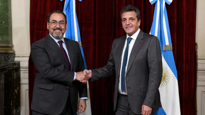 Durante el encuentro, Massa y el presidente ejecutivo de la CAF analizaron la cartera de crédito de la institución en la Argentina, así como el desempeño de los nuevos créditos en marcha destinados a educación, estructuras binacionales y agua y saneamiento.
