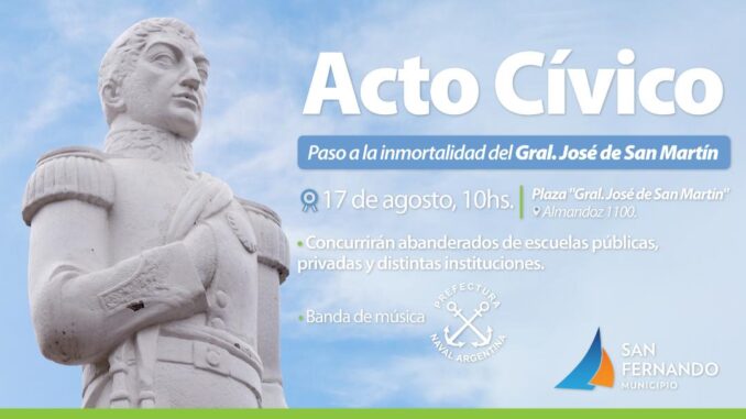 El miércoles 17 de agosto, a las 10 horas, en el marco del 172° aniversario del paso a la inmortalidad del General José de San Martín, el Municipio de San Fernando invita a vecinos y vecinas a participar de un acto cívico en su memoria que contará con el acompañamiento de abanderados de escuelas e instituciones de la ciudad, números artísticos y la Banda de la Prefectura Naval Argentina.