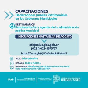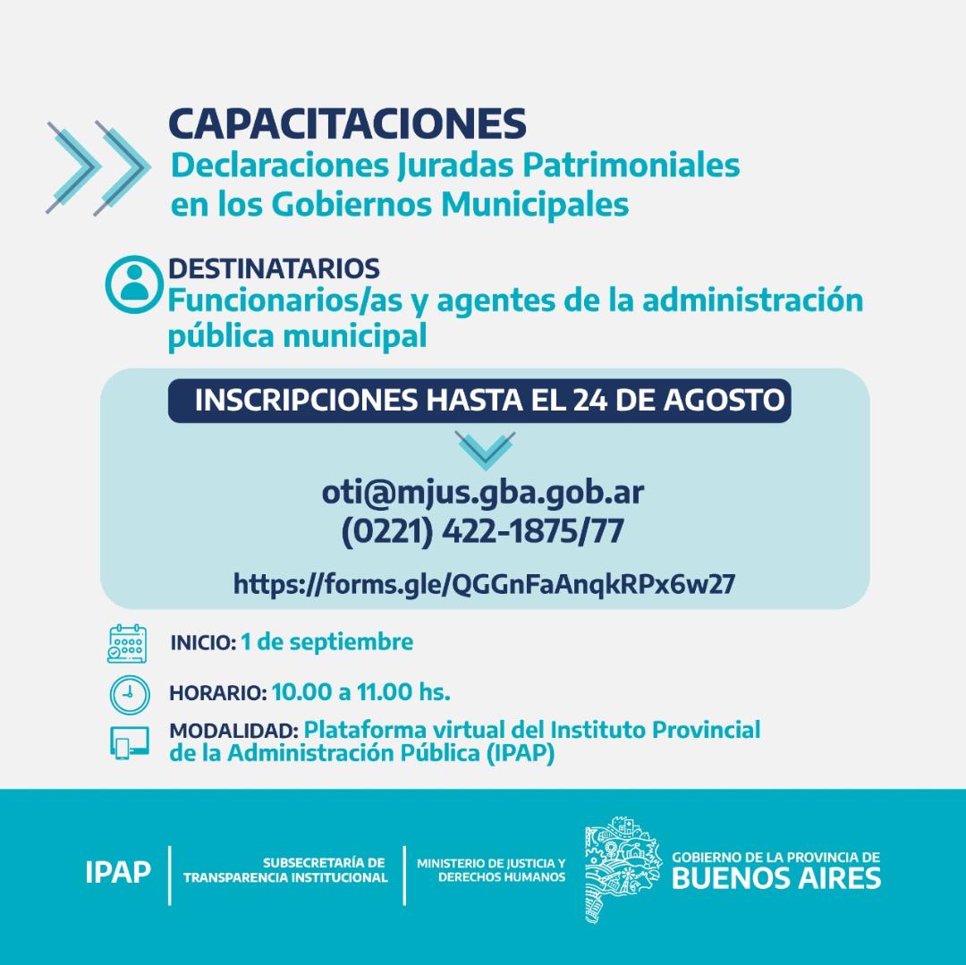 La Subsecretaría de Transparencia Institucional, perteneciente al Ministerio de Justicia y Derechos Humanos de la Provincia, junto al Instituto Provincial de la Administración Pública (IPAP), lanzan la capacitación sobre el Sistema de Declaraciones Juradas Patrimoniales, que busca brindar herramientas sobre la temática a trabajadores, trabajadoras, funcionarias y funcionarios pertenecientes a la administración pública municipal.