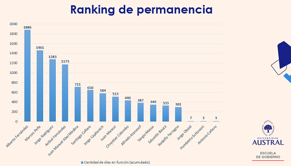 Sólo seis jefes de gabinete superaron ese promedio: Alberto Fernández (1660 días con Néstor Kirchner), Marcos Peña (1461 días con Mauricio Macri), Jorge Rodríguez (1283 días con Carlos Menem), Aníbal Fernández (886 días con Cristina Kirchner -primer mandato-), Juan Manuel Abal Medina (711 días con Cristina Kirchner -segundo mandato-) y Santiago Cafiero (650 días con Alberto Fernández).