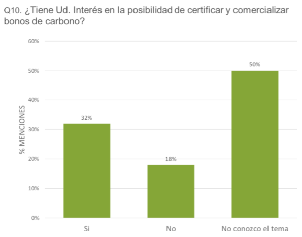 Así, la mitad de los productores manifiesta no tener conocimiento alguno sobre el tema. La encuesta también confirma que hay un 32% de productores interesados y un 18% que no le interesa el tema. Al respecto de la factibilidad concreta de certificar bonos, solo un 15% dijo que lo ve factible en el corto plazo, mientras que un 72%, solo en un mediano plazo.