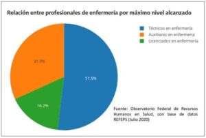 “Según cifras del Observatorio Federal de Recursos Humanos en Salud (julio 2020), el 16,2% del personal de enfermería en el país es licenciado en Enfermería, el 51,9% es enfermero/a y el 31,9 % es auxiliar de enfermería”.