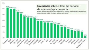 “En los últimos años se observa un aumento del número de licenciados y licenciadas que resulta consistente con las políticas actuales del Ministerio de Salud de la Nación. No obstante, hay una disparidad muy grande en el nivel de formación alcanzado si comparamos la situación a lo largo del país. Mientras que en Neuquén (26%), CABA (25%) y Mendoza (24,8%), la proporción de licenciados en relación al personal total de enfermería es del 25%, en 8 provincias argentinas (La Rioja, Corrientes, Chaco, San Luis, Misiones, Catamarca, Tucumán y Santiago del Estero) ese porcentaje oscila entre el 1,4% y el 9,6%”.