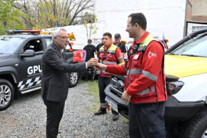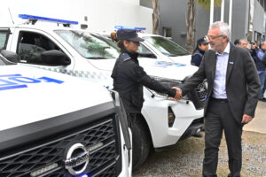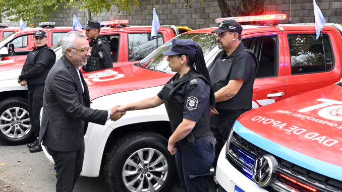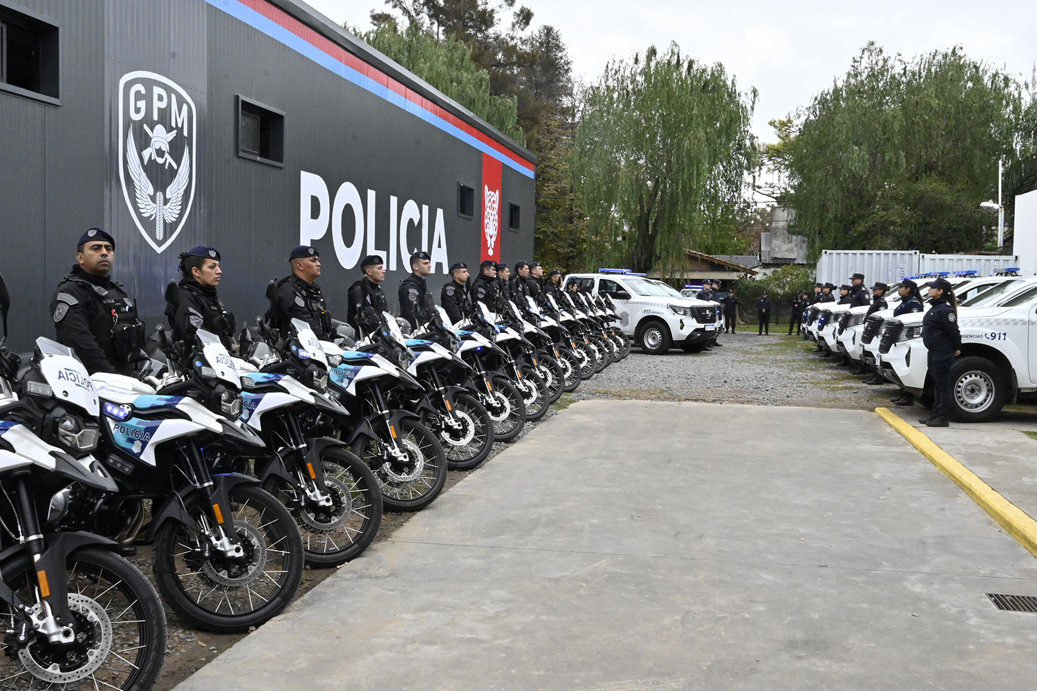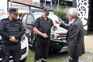 “Es un equipamiento muy importante para nuestra comunidad. Quiero en principio agradecer al Gobierno de la Provincia, porque mediante el convenio que firmamos, estamos incorporando 20 móviles y 15 motos para la policía. El Municipio hizo este edificio para la reserva, para la guarda de las motos, y también incorporamos los móviles de la Provincia. Simultáneamente estamos incorporando 10 vehículos para nuestro servicio de Protección Ciudadana y una camioneta para Defensa Civil. Todo este equipamiento es para brindar mayor seguridad a los vecinos”, destacó el jefe comunal.