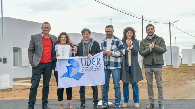 El gobernador de la provincia de Buenos Aires, Axel Kicillof, encabezó esta mañana el acto de entrega de 22 viviendas en el barrio Unión de Educadores de Rauch (UDER), destinadas a familias de docentes afiliados a la Federación de Educadores Bonaerenses (FEB). Fue junto al ministro de Hábitat y Desarrollo Urbano, Agustín Simone; el intendente local, Maximiliano Suescun; y la concejala María Lamarche.