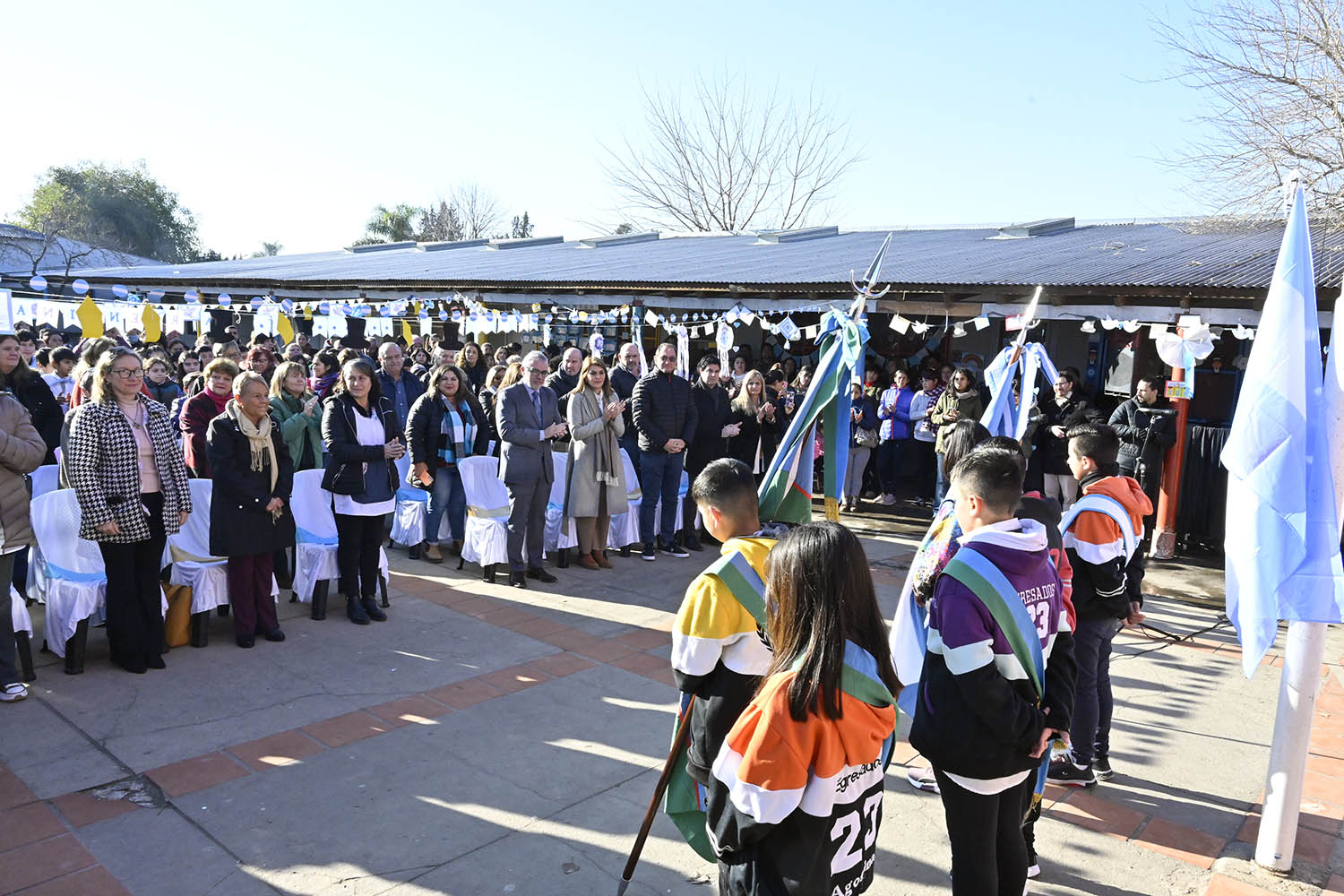 La jornada inició con un desayuno de camaradería, donde el jefe comunal dialogó con directivos de la institución, ex alumnos y alumnas. Posteriormente, dio comienzo el evento formal con la entonación del Himno Nacional, interpretado por estudiantes mediante una orquesta y lengua de señas. Luego, el intendente y la comunidad educativa realizaron el izamiento de la bandera Argentina.