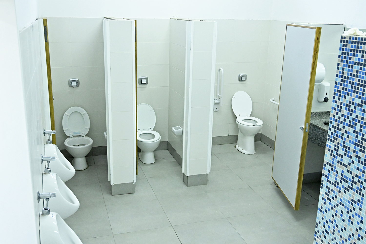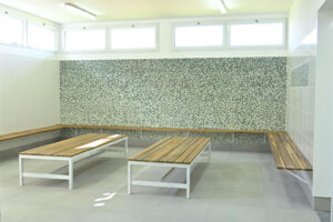 El espacio adyacente a la pileta cuenta con una superficie de 300 m2, sectores para personas con discapacidad, 12 duchas, bachas, espejos, piso antideslizante y losa radiante para la climatización durante la temporada de invierno.