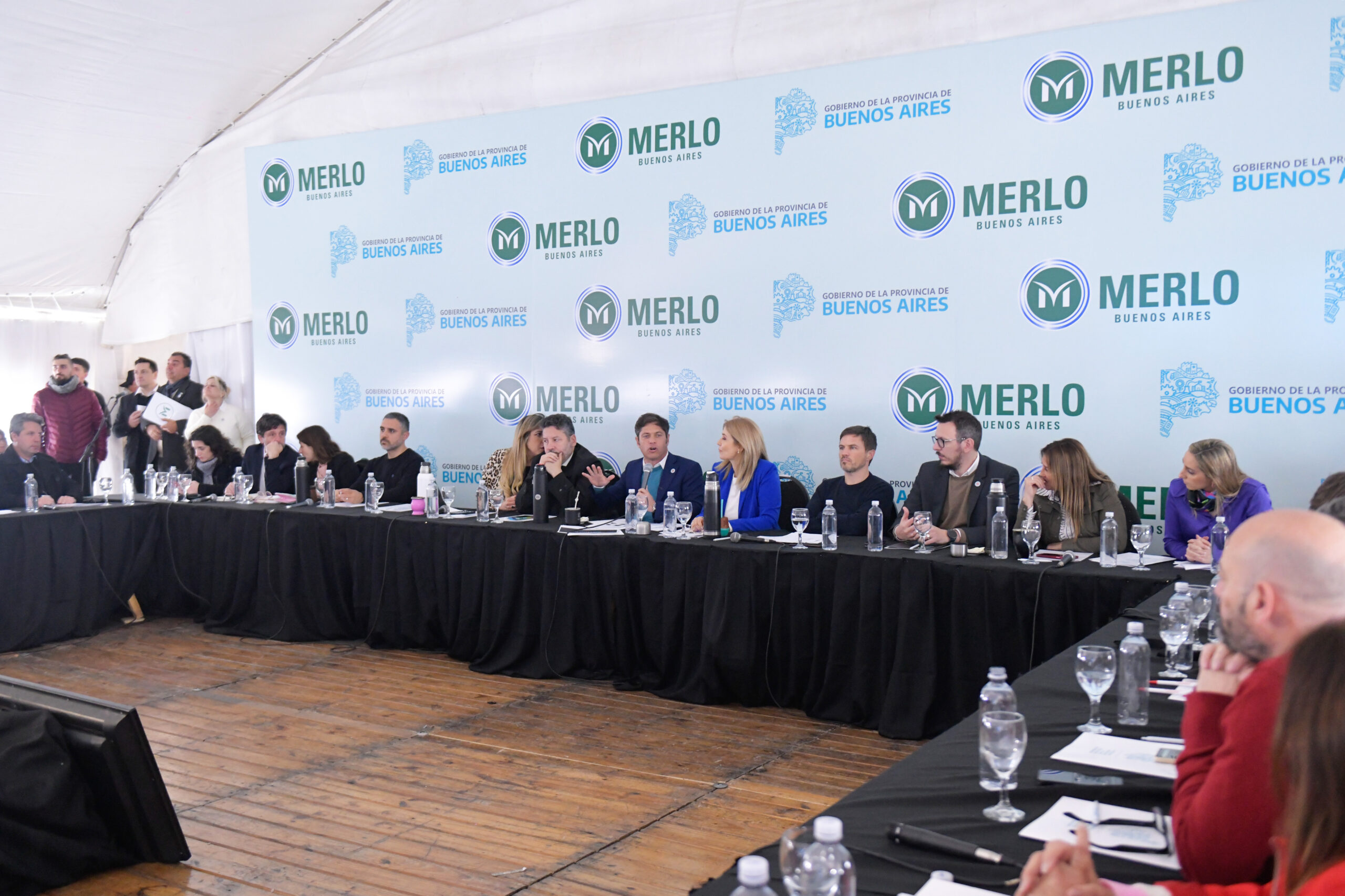 El gobernador Axel Kicillof encabezó este lunes una reunión con empresarios bonaerenses y representantes del sector productivo de toda la provincia, en el marco de la Expo de la Industria y la Producción “Hecho en Merlo”. Fue en la Quinta La Colonial del Parque Municipal Néstor Kirchner, junto a la vicegobernadora Verónica Magario; el ministro de Producción, Ciencia e Innovación Tecnológica, Augusto Costa, y el presidente del Grupo Provincia, Gustavo Menéndez.