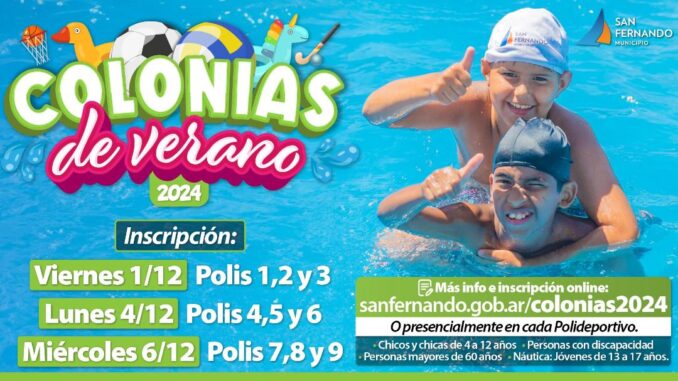El Municipio de San Fernando inició la inscripción a las Colonias de Verano 2024 de forma digital ingresando a www.sanfernando.gob.ar/colonias2024o presencial acercándose a los Polideportivos municipales. El proceso tiene 3 fechas como punto de partida según cada sede: Desde el viernes 1/12: Polis N°1, N°2 y N°3. Desde el lunes 4/12: Polis N°4 (Personas Mayores), N°5 y N°6. Desde el miércoles 6/12: Polis N°7, N°8 y N°9