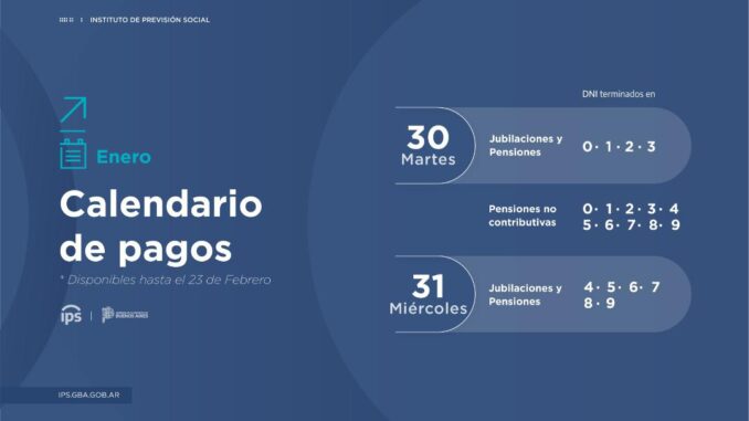El Instituto de Previsión Social (IPS) informa que, hoy miércoles 31, continúa el pago de los haberes de enero para las personas jubiladas y pensionadas de la provincia de Buenos Aires, según cronograma que se detalla a continuación: Miércoles 31 de enero: para jubilaciones y pensiones con DNI terminados en 4, 5, 6, 7, 8 y 9.