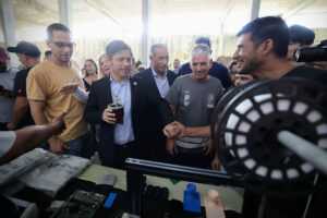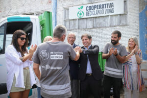 Durante la jornada, Kicillof recorrió junto a la ministra de Ambiente, Daniela Vilar la planta de reciclaje del municipio donde funciona la Cooperativa Reciclando Vidas. En el acto, se hizo entrega de un camión de caja abierta para la recolección diferenciada de residuos, que se suma al camión volquetero, al autoelevador y a la cinta de clasificación, entre otras herramientas, entregadas anteriormente a la cooperativa dentro del programa “Mi Provincia Recicla”.