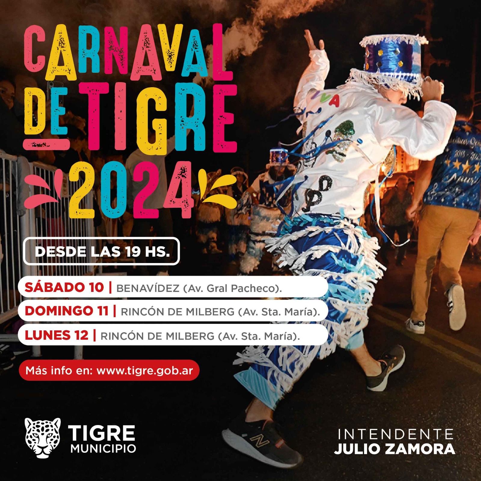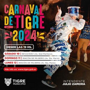 El Municipio de Tigre llevará adelante la 14° edición de los Carnavales, con la participación de murgas y agrupaciones locales. Se realizarán el sábado 10 en Benavídez sobre Av. General Pacheco, el domingo 11 y el lunes 12 en Rincón de Milberg sobre Av. Santa María desde las 19hs. En el acto de apertura, se va a presentar la primera tribu municipal de danza urbana junto a escuelas de danza urbana del distrito.
