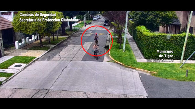 Tras una ardua investigación y el análisis de las cámaras de seguridad del Municipio de Tigre, se pudo determinar el recorrido que hizo el sospechoso para huir del lugar del hecho. En las imágenes, que fechan del día sábado, se puede observar al sujeto huyendo a bordo de una bicicleta.