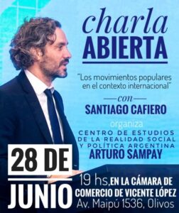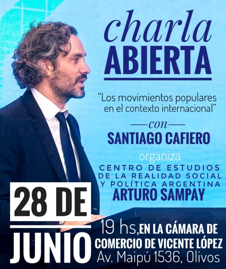 A instancias del Centro de Estudios de la Realidad Social y Política “Arturo Sampay”, el próximo 28 de junio, a las 19, el diputado nacional y ex canciller, Santiago Cafiero, estará abordando una charla debate que lleva como título “Los movimientos populares en el contexto internacional”.