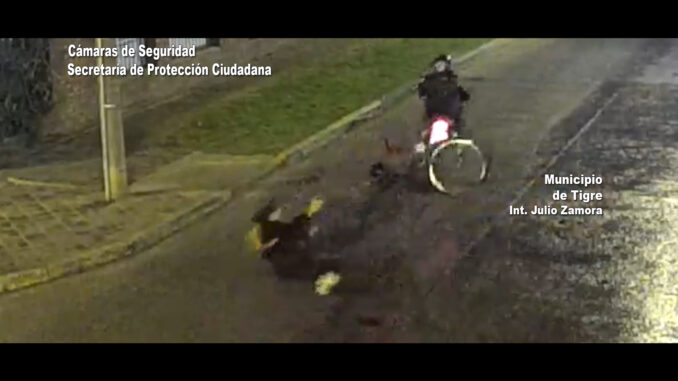 En Don Torcuato, las cámaras del Centro de Operaciones Tigre (COT) captaron un accidente de tránsito entre una moto y una bicicleta. Tras cometer el incidente, el motociclista se dio a la fuga, pero luego volvió al lugar del hecho.