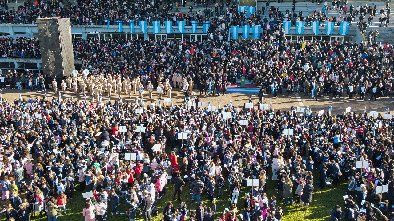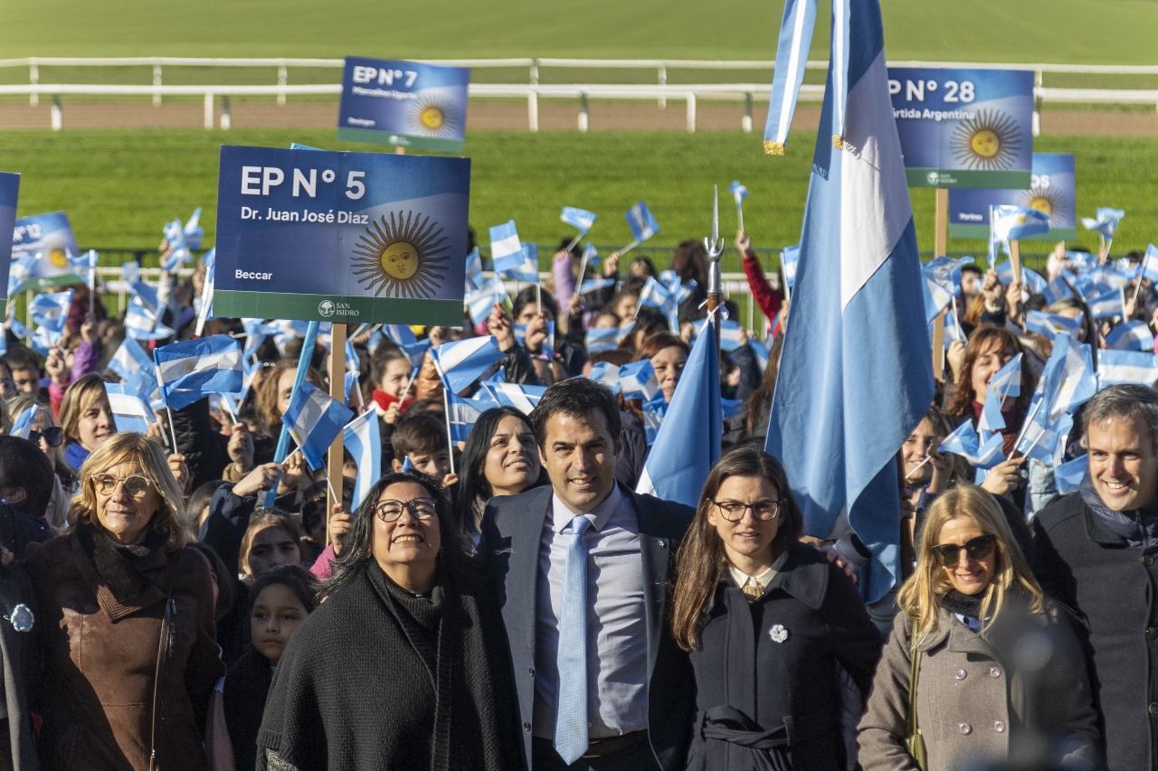 El acto en homenaje a Manuel Belgrano, que se realizó en el sector de las tribunas de un Hipódromo teñido de celeste y blanco, comenzó con la entonación de las estrofas del Himno nacional por parte de la Banda de la Prefectura Naval Argentina. Luego tuvieron lugar las palabras de la subdirectora de Inspección General, Adriana Juárez, y del intendente, quien les tomó la promesa a los chicos. Para finalizar, se realizó un show ecuestre, a cargo de la Escuadra de Arte Ecuestre Amazona argentinas.