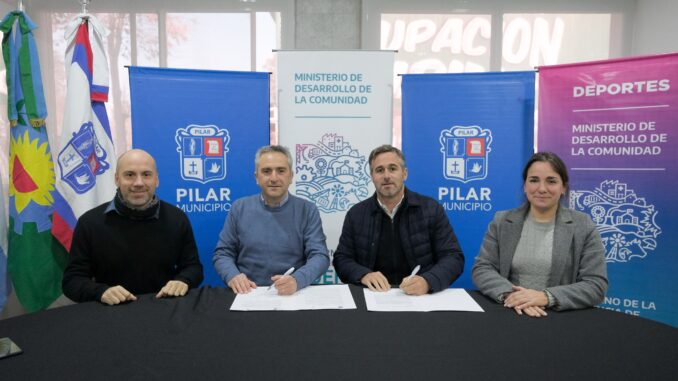 El ministro de Desarrollo de la Comunidad, Andrés Larroque, y el intendente de Pilar, Federico Achával, firmaron dos convenios para la compra de equipamiento deportivo y la puesta en valor de la plaza “El Manzanar” del distrito, con la presencia del subsecretario de Deportes, Leandro Lurati y la directora provincial de Intervenciones Complementarias de la Subsecretaría de Hábitat de la Comunidad, Érica Osterrieth.