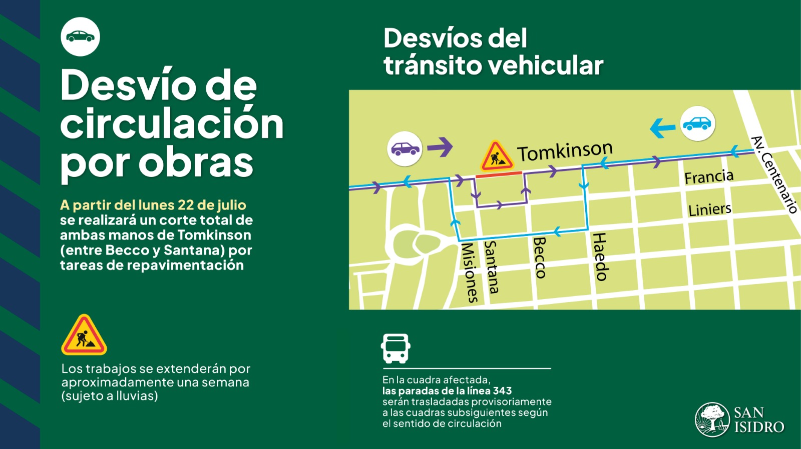 El Municipio de San Isidro comenzó las tareas de repavimentación en la calle Tomkinson, por lo que se realizará un corte total entre Becco y Santana a partir del lunes 22 de julio. Los trabajos se extenderán por aproximadamente una semana (sujeto a lluvias).