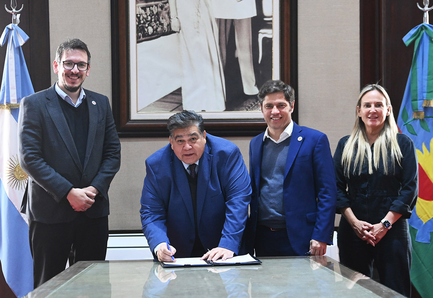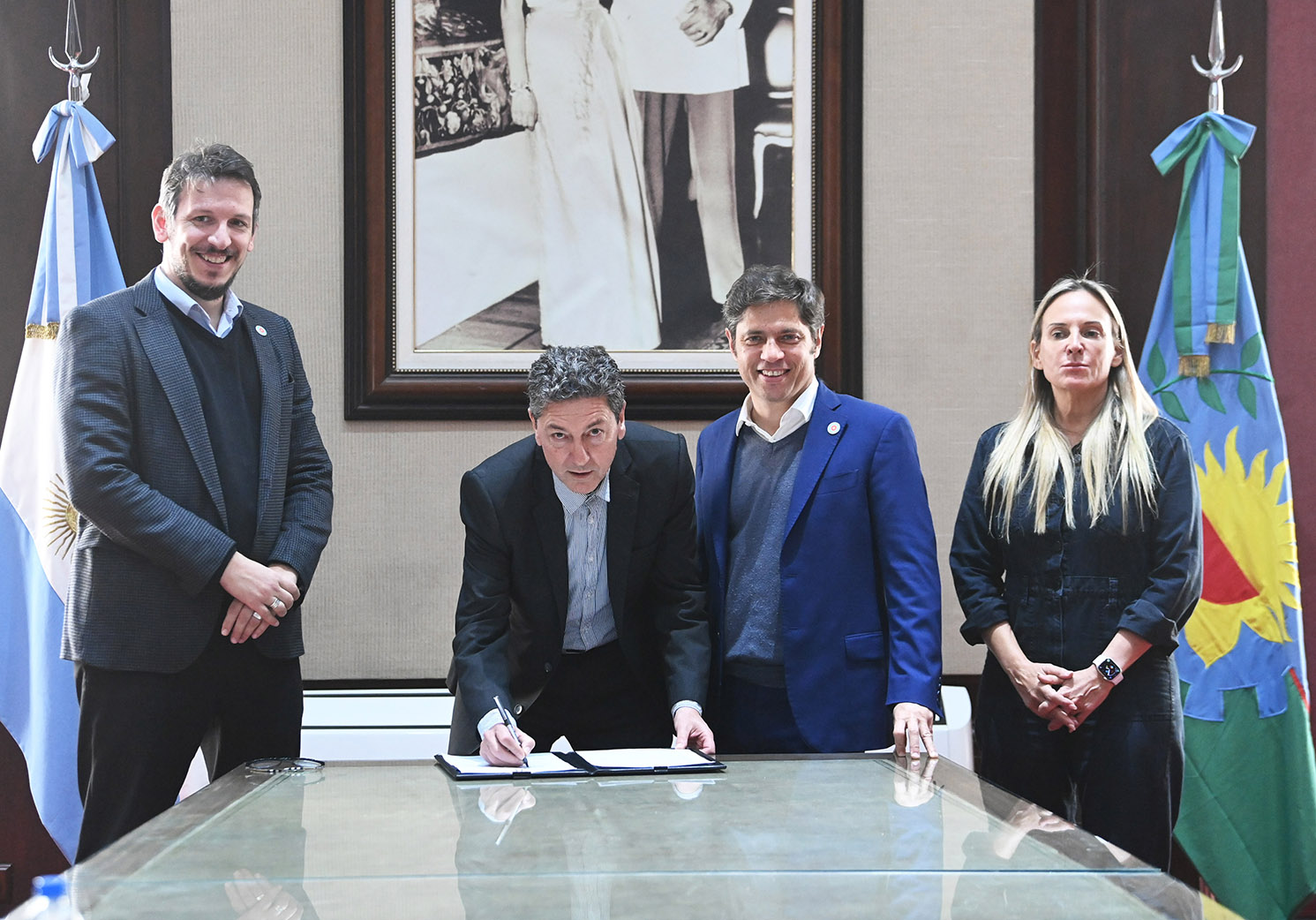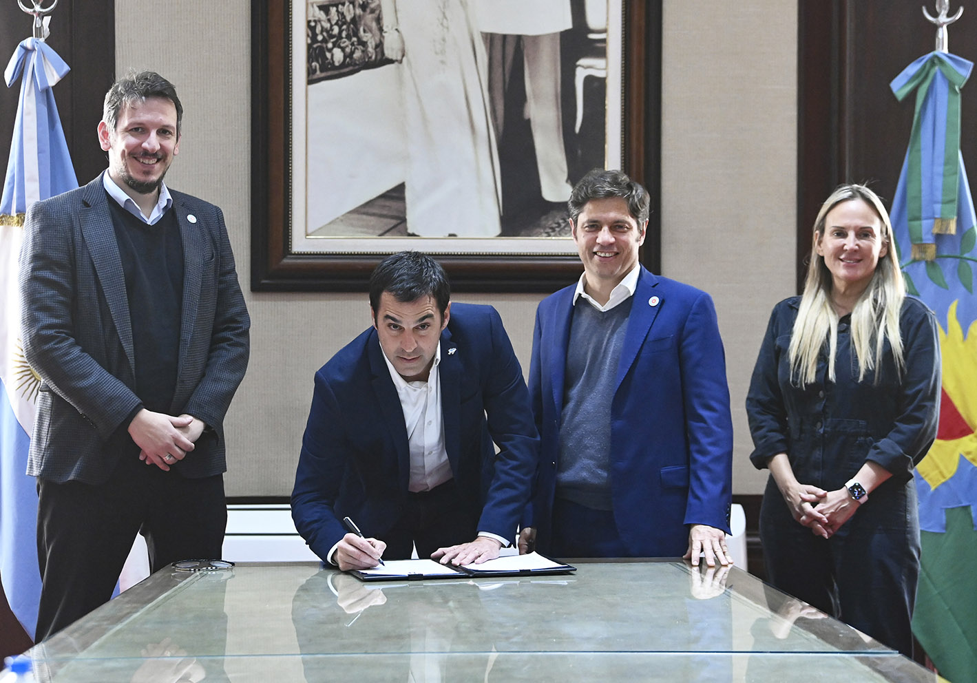 El gobernador Axel Kicillof encabezó este jueves junto al presidente del Banco Provincia, Juan Cuattromo, el acto de firma de contratos de leasing por $4.278 millones para la compra de bienes de capital en siete municipios bonaerenses. Fue en el Salón de Acuerdos de la Casa de Gobierno, acompañado por el ministro de Gobierno, Carlos Bianco.