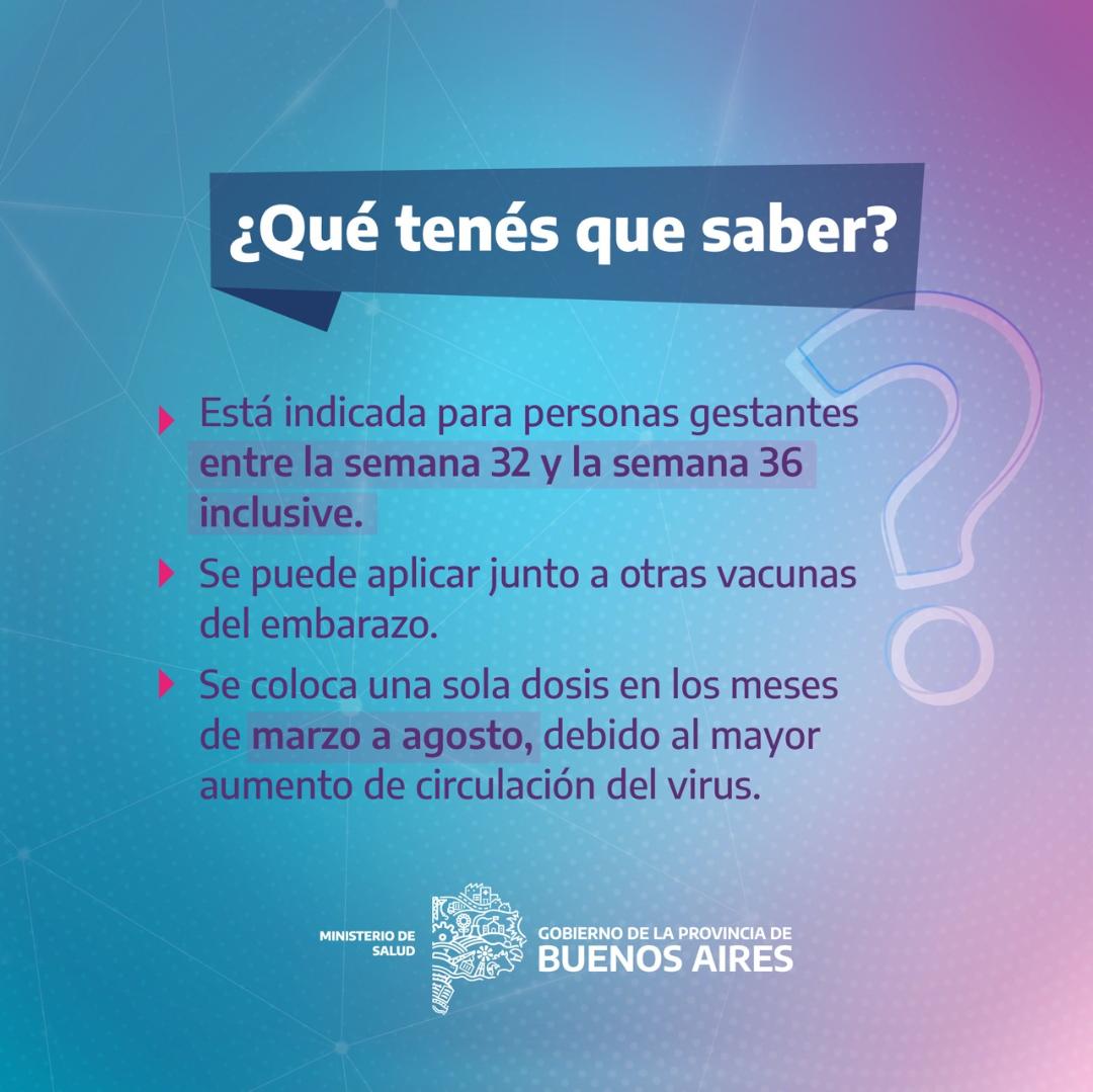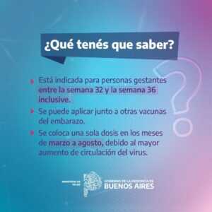 El ministerio de Salud de la Provincia de Buenos Aires convoca a las embarazadas de entre 32 y 36 semanas de gestación a vacunarse contra el Virus Sincicial Respiratorio antes del 31 de agosto, último día de este año en que se aplicará esta vacuna que previene la bronquiolitis. Con esta inmunización se protege a el o la bebé por nacer de esa infección respiratoria que constituye la primera causa de internaciones en invierno y uno de los principales motivos de mortalidad infantil.