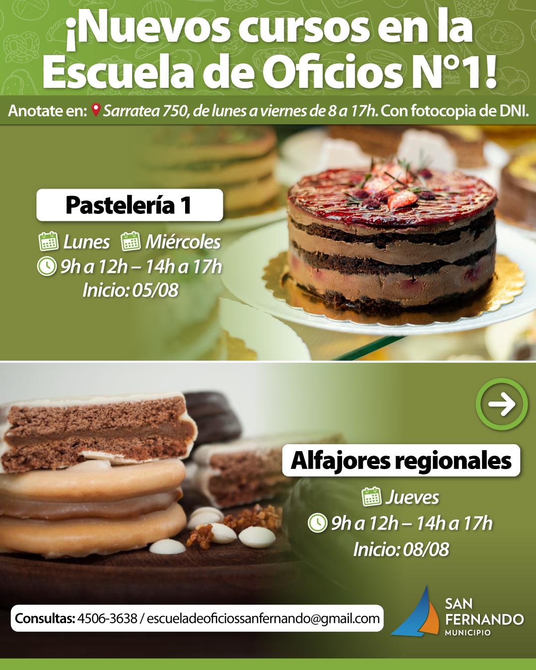 Pastelería 1: Lunes de 9 a 12 hs. (turno mañana) o de 14 a 17 hs. (turno tarde). Inicia el 5 de agosto. Miércoles de 9 a 12 hs. (turno mañana) o de 14 a 17 hs. (turno tarde). Inicia el 7 de agosto.