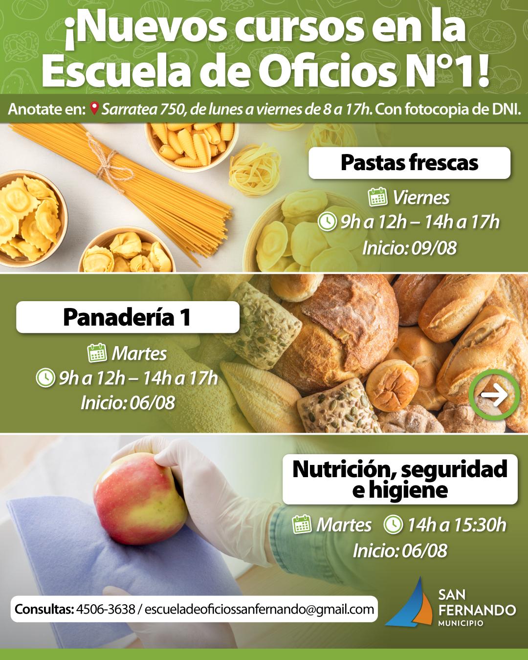 El Municipio informa a sus vecinas y vecinos que ya está abierta la inscripción de forma presencial para los siguientes cursos gratuitos que se dictarán en la Escuela de Oficios N°1 (Sarratea 750). Los requisitos son ser mayor de 18 años, residir en San Fernando y presentar una fotocopia de DNI que lo acredite.
