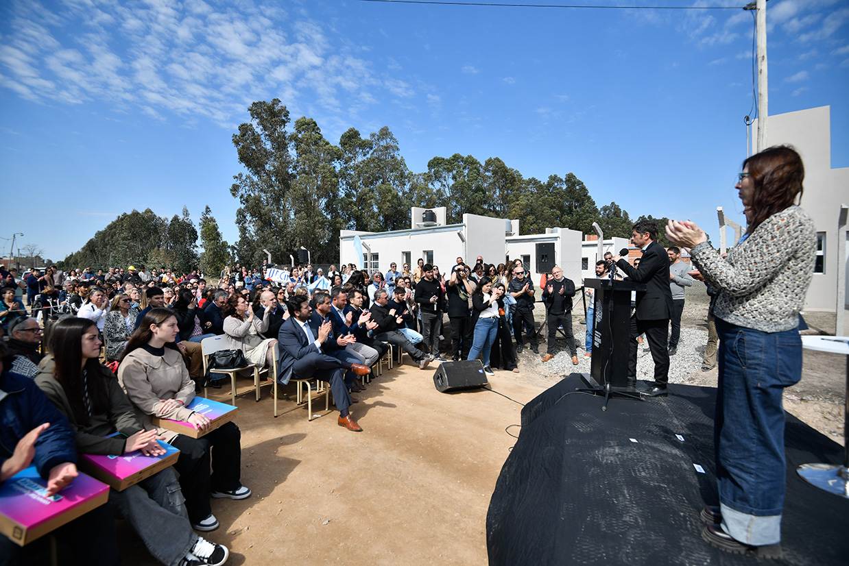 El gobernador de la provincia de Buenos Aires, Axel Kicillof, encabezó este miércoles el acto de entrega de 10 viviendas a familias de Lobería, junto a la ministra de Hábitat y Desarrollo Urbano, Silvina Batakis, y el intendente local, Pablo Barrena.