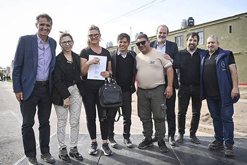 El gobernador de la provincia de Buenos Aires, Axel Kicillof, encabezó este viernes el acto de entrega de 18 viviendas en Bahía Blanca, junto a la ministra de Hábitat y Desarrollo Urbano, Silvina Batakis; el intendente local, Federico Susbielles; y el secretario general del Sindicato Único de Trabajadores de la Industria de Aguas, Gaseosas y Afines (SUTIAGA), Marcelo Colombo.