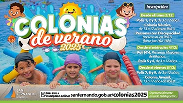 El Municipio de San Fernando empezará la inscripción a las Colonias de Verano 2025 de forma digital ingresando a la webwww.sanfernando.gob.ar/colonias2025o presencial acercándose a los Polideportivos municipales.