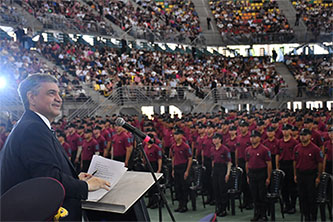 Por primera vez, como lo prometió el Jefe de Gobierno, la jura se realizó fuera del Instituto Superior de Seguridad Pública, y no hubo cupo de ingreso para que los familiares pudieran seguir el emotivo momento desde un lugar más amplio y cómodo, las plateas del Estadio Mary Teran de Weiss.