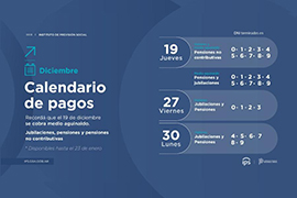 Jueves 19 de diciembre: Haberes de diciembre y medio aguinaldo (Sac proporcional): para Pensiones sociales -no contributivas- con DNI terminados en: 0, 1, 2, 3, 4, 5, 6, 7, 8 y 9; Medio aguinaldo (Sac proporcional): Pensiones y jubilaciones con DNI terminados en: 0, 1, 2, 3, 4, 5, 6, 7, 8, 9.